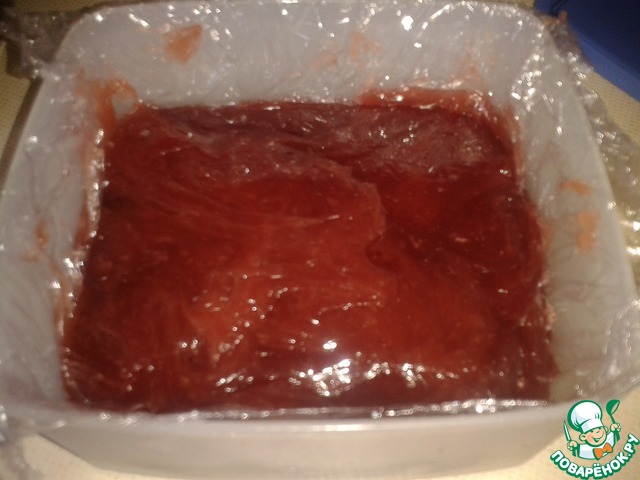 Контейнер застилаем пищевой пленкой, чуть остывшую массу выкладываем в контейнер, поверхность разглаживаем ложкой, смазанной растительным маслом. Оставляем открытым, чтобы лукум подсох на 24 часа.