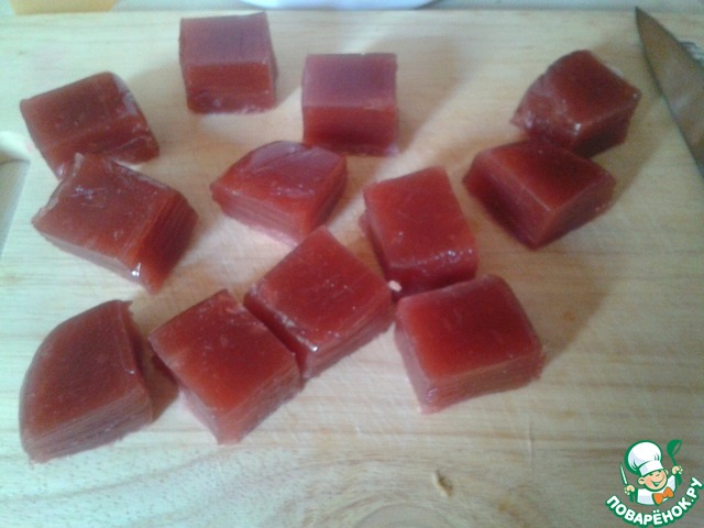 Ножом, смазанным растительным маслом, пилящими движениями аккуратно разрезаем лукум на кубики. Отличный цвет!