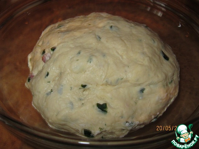 Поместить все ингридиенты в тестомес, добавить горсть рубленой зелени (она придаст тесту тонкую нотку начинки) и замесить тесто. Оно получится не тугим-мягким и покладистым. Накроем и отставим на время приготовления начинки
