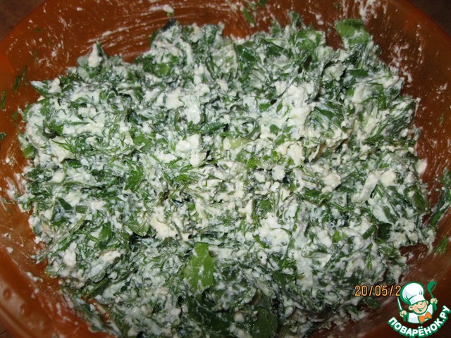 Начинка: размять творог вилкой с яйцами, сметаной и солью. Добавить зелень и размешать до однородности