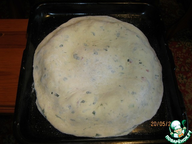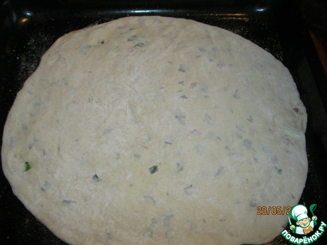Тесто разделить на две равные части. На припыленном мукой столе раскатать первый круг диаметром 30 см. Он получится не тонким, около 0,5 см толщиной. Перенести его на смазанный и притрушенный мукой противень.
