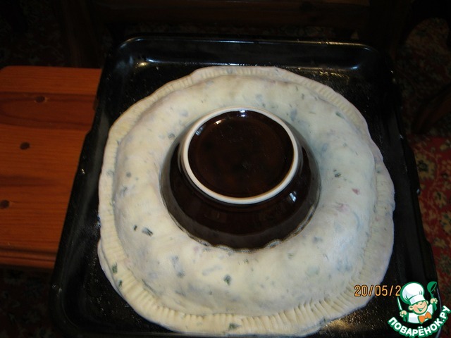 Пошла в ход наша загадочная мисочка. Для чего она нам? 1)придаст ровную форму круга; 2)разделит центральную начинку от той, что по кругу; 3)поможет, не исказив будущий пирог, ровно нарезать лепестки. Мисочку плотно прижать. Края защипать вилкой