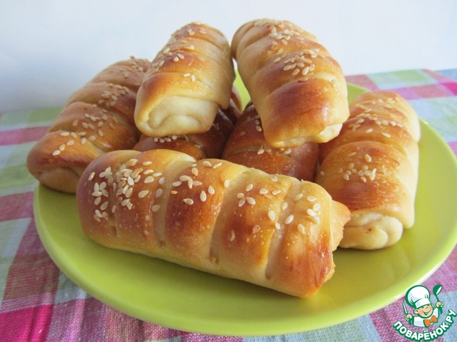 Протвинь застелить бумагой для выпечки и смазать растительным маслом. Выложить трубочки на противень швом вниз. С помощью пищевой кисточки смазать трубочки водичкой и посыпать кунжутом. Выпекать трубочки в духовке, заранее разогретой до 200 градусов, 20 минут.