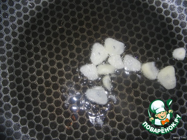 Чеснок нарезаем колечками, обжариваем в растительном масле (лучше оливковом). Потом удаляем чеснок, он нужен только для запаха.