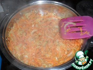 К луку добавить морковь и жарить еще 5 мин. Затем овощи немного подсолить.