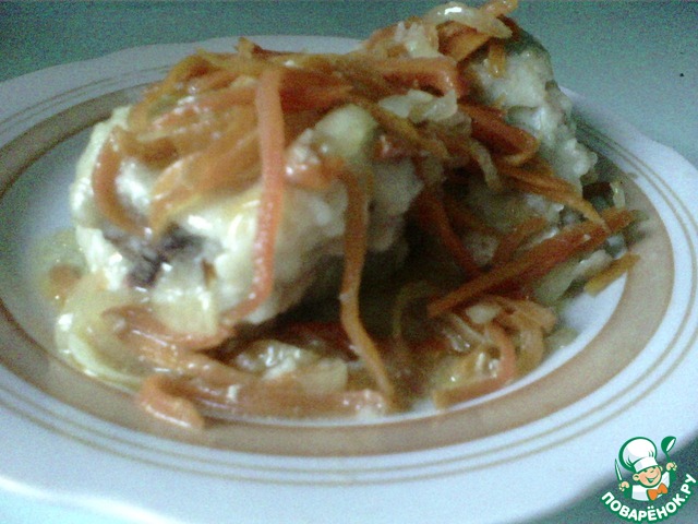 На обжаренные кусочки минтая сверху выложите приготовленные до этого овощи, залейте примерно 100-200 мл. воды и еще раз немного посолите.