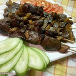 Нам нужны деревянные шпажки. Нанизать на них по очереди курагу и печень. Желательно, чтобы по краям была курага, так она будет удерживать кусочки печени при жарке.