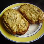 • На белый хлеб или батон намазать тонким слоем сливочное масло. Сверху выложить творожную массу. Запечь в духовке до зарумянивания (190 гр - около 10 минут)