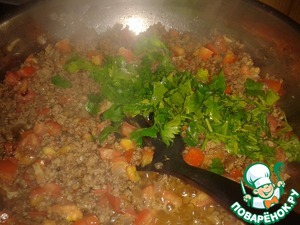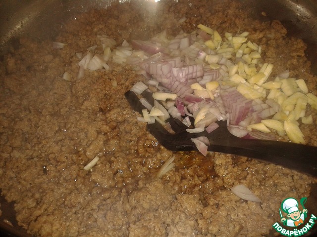 В сковороду наливаем масло, выкладываем фарш, обжариваем с добавленим лука и чеснока (мелкопорезанных).