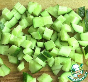 В посуду руками рвем листья салата, добавляем кубики авокадо и огурцов, перемешать.