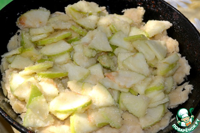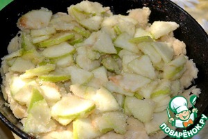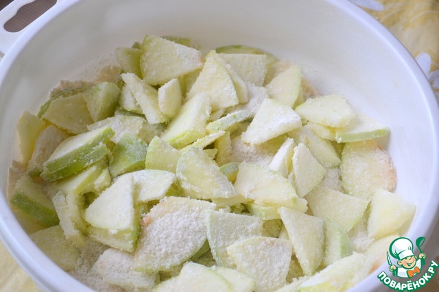 Начинку готовим так. Режем яблоки небольшими ломтиками. Просеиваем 3 ст. ложки муки, добавляем сахар и смешиваем это все с яблоками.