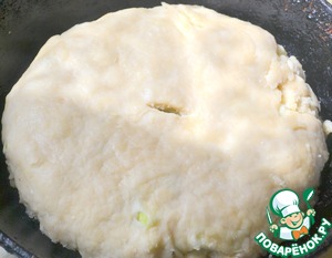Тесто делим на две части, большую и меньшую. В форму для выпечки выкладываем большую часть теста, распределяем и делаем небольшие бортики. Выкладываем на тесто начинку. Закрываем второй половиной теста (тесто удобнее выкладывать руками, чем раскатывать)