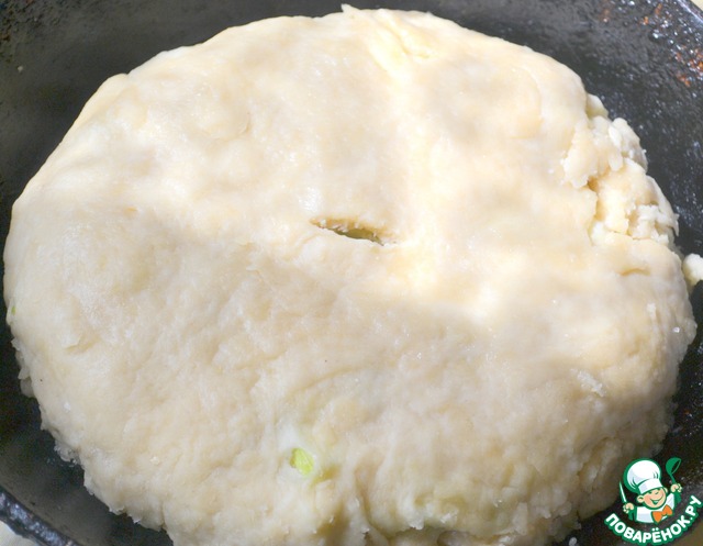 Делаем в середине пирога отверстие и смазываем пирог растительным маслом. Выпекаем в предварительно разогретой духовке 50-60 минут.