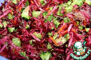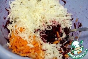 Свеклу натереть на терке и смешать с 1 ст. л. оливкового масла, что бы свекла не окрашивала остальные ингредиенты. Свеклу используем сырую. Только так в ней можно сохранить все витамины и минералы.