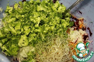 Брокколи мелко нарезать и добавить в салат. Следом добавить ростки.