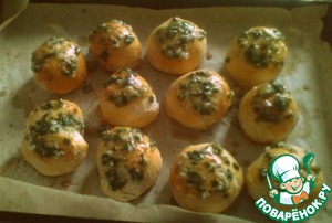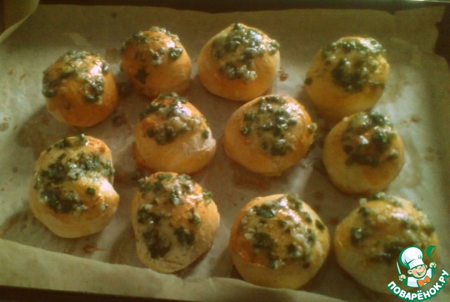 Испеченные пончики вынуть из духовки и сразу же смазать чесночной заправкой.