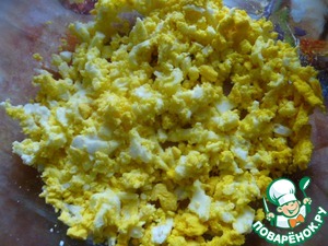 Сверху насыпать измельченное яйцо. Можно сначала налить часть теста, а потом яйцо.