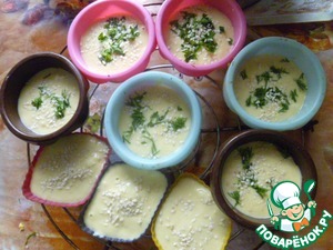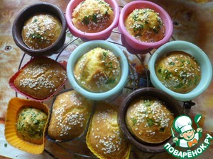 Теперь наливаем тесто в формочки. Посыпать кунжутом и зеленью.