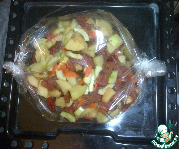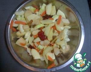 Нарезать кабачок (очищенный от семечек), очищенное яблоко, картошку ломтиками средней величины. Морковь соломкой тонкой. Также добавить запаренные помидоры черри и изюм.