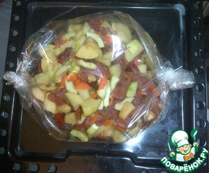 Заложить всё в рукав для запекания. В духовку на 45 минут. Потом проколоть рукав сверху и запекать до выпаривания жидкости и до образования небольшой корочки на картошке.