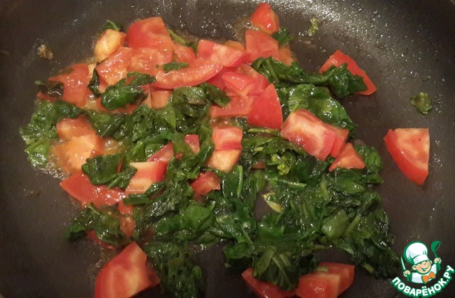 В этом же масле обжариваем шпинат с поре3анными на кусочки помидорами (черри режем половинками). Совсем немного присаливаем-перчим.