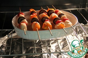 На шпажки насадить чередую морские гребешки, перец, грибы и помидоры.