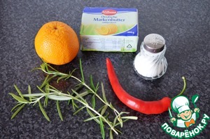 Апальсин, перчик и веточки розмарина помыть и обсушить бумажным полотенцем. Цедру апельсина, натереть на мелкой тёрке. От розмарина нам понадобятся только листики, мелко нарезать. Перчик очистить от семян и тоже мелко нарезать.