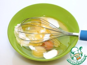 Взбить яйца со сливками. Сыр натереть на мелкой терке и добавить в яичную смесь.