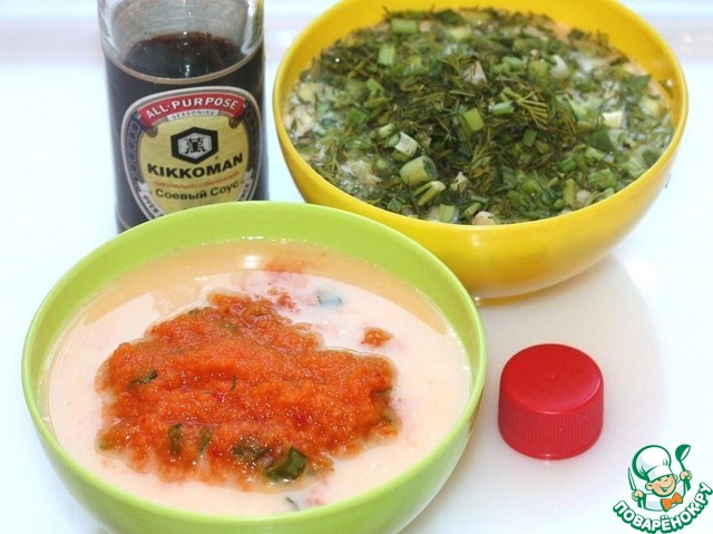 В одну миску добавить острый соус. В другую миску выложить зелень. В каждую миску добавить по 1 ч. л. соевого соуса и при необходимости посолить.