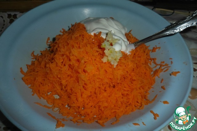 4. Делаем начинку. Натираем морковь на мелкой терке, выдавливаем в нее чеснок, добавляем сметаны и все перемешиваем.