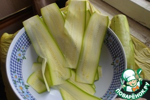 5. Нарезаем кабачки на тонкие полоски, чем тоньше - тем лучше. Я это делаю на специальной терке.