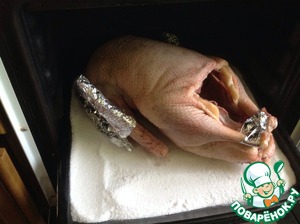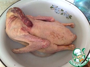 Необходим целый гусь (у меня была тушка 3 кг) и 2 пачки соли без добавок. Гуся нужно сутки вымочить в воде.