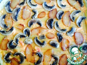 Прочитав отзывы, решила вначале испечь тесто до полуготовности. Потом помазала соусом и выложила начинку.