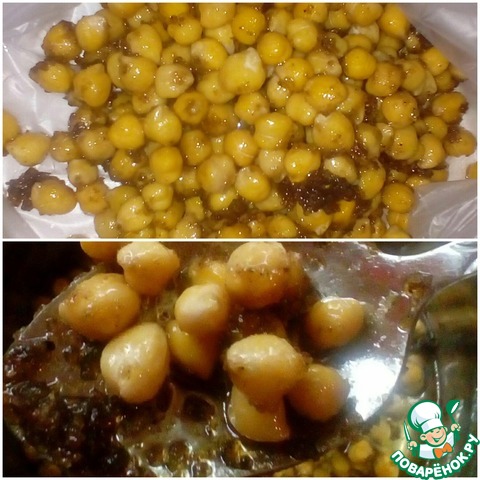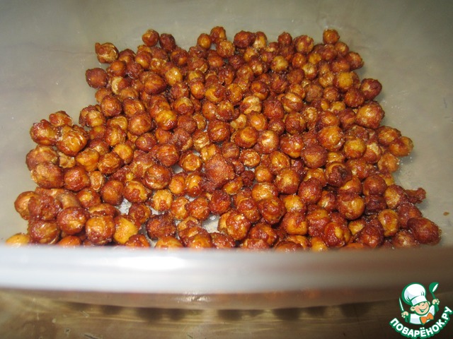 Перемешать чтобы крахмал полностью покрыл нут. Обжарить во фритюре на небольшом огне 7-10 минут в зависимости от желаемой хрусткости внутри нута и внешней корочки. Делать это нужно осторожно поскольку нут во время жарки может "стрелять".