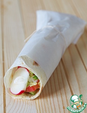 На лаваш укладываем огурец, помидор, редис и тонко нарезанный лук-шалот, сверху кладем капусту в соевом соусе и немного сметаны.