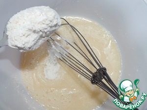 В яичную смесь по ложке добавить мучную смесь, размешивая венчиком