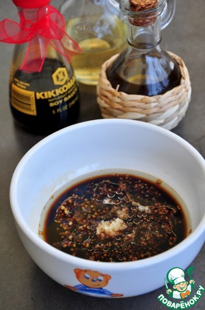 Смешать в глубокой пиале 4ст. л. соевого соуса, 1 ст. л. белого бальзамического уксуса, 2 ст. л. оливкового масла, 1 ст. л. зерновой горчицы, зубок чеснока, пропущенный через пресс, 1 ч. л. коричневого сахара (по желанию).