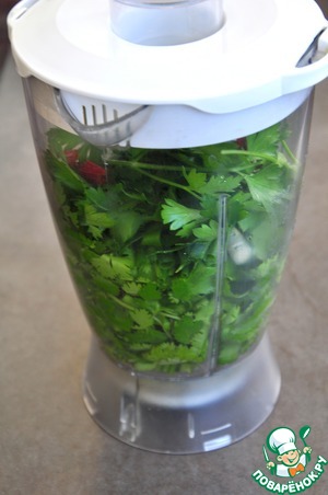 Сложить в блендер кинзу (если не любите, замените на базилик), петрушку, зеленый лук, чеснок, чили перец по вкусу, кусочек имбиря. Подливая понемногу оливковое масло, пюрировать зелень до однородного состояния. Густоту соуса регулируйте по своему вкусу (я люблю густой как песто). При желании, можно потереть для большего аромата цедру половины лимона.
