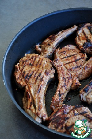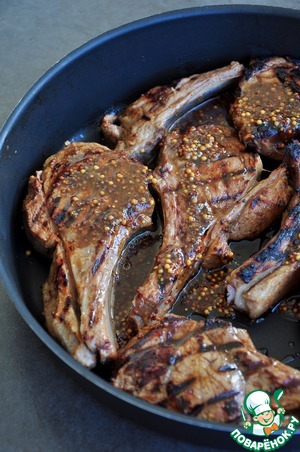 Силиконовой кисточкой снять я мяса зерновую горчицу иначе она будет пригорать при приготовлении. Обжарить каре на сковороде-гриль по 4 минуты с каждой стороны. Переложить в форму для запекания.