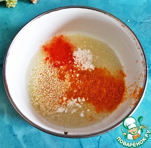 Яичный белок слегка взбить. добавить крахмал, порошок карри и кунжут.