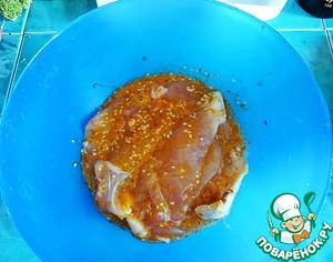 Когда будут готовы угли в мангале, маринад, который вы принесли с собой, вылейте на куриную грудку и хорошо перемешайте его, перевернув мясо несколько раз.