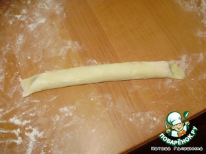 Каждый "колобок" раскатать тонко-тонко (как бумага), на середину выложить в рядок вишни, слегка присыпать их мукой (для впитывания лишнего сока).