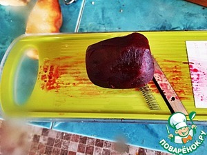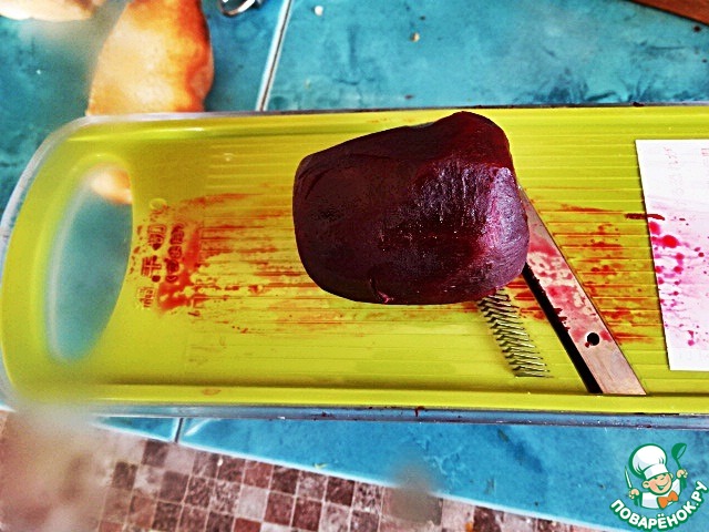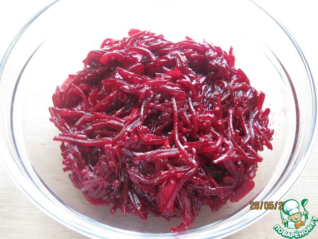 Отварную свеклу натереть тонкой соломкой на специальной тёрке.