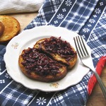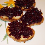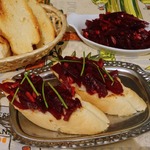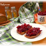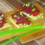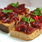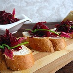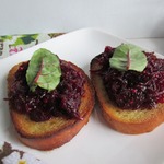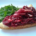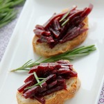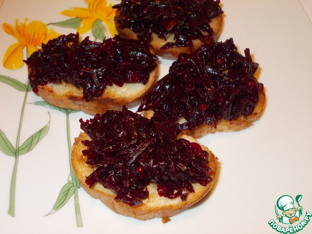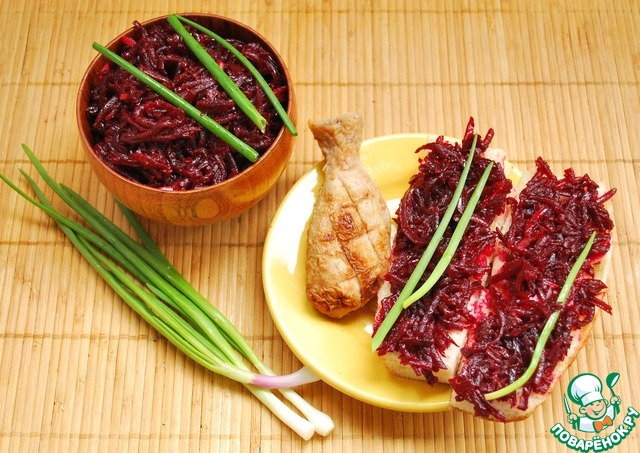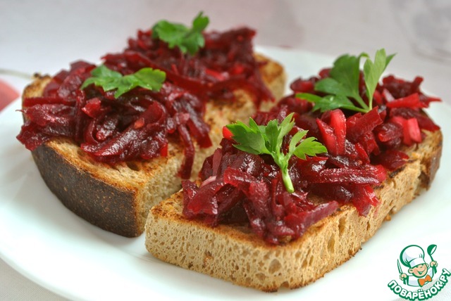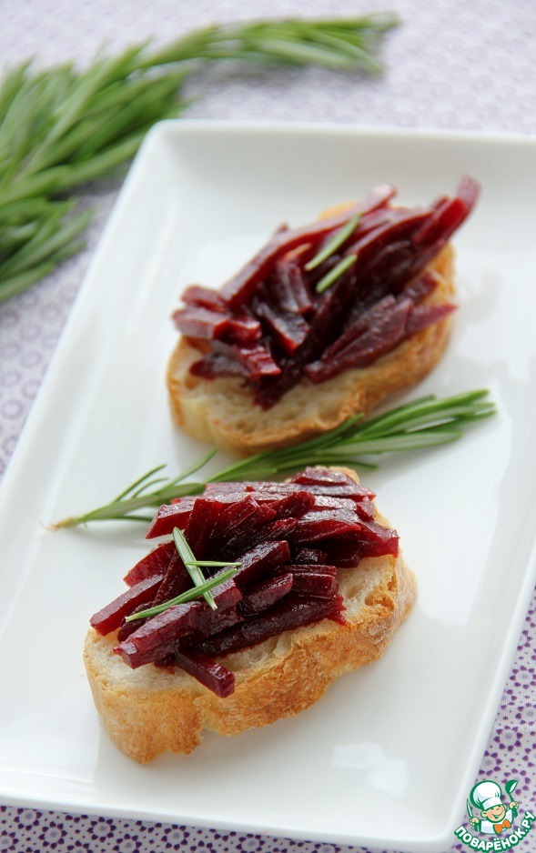 Если вы будете подавать свеклу дома, то кусочки багета можно поджарить в духовке, сбрызнув их оливковым маслом. Украсить бутерброды порезанным шнитт-луком и листочками мангольда.