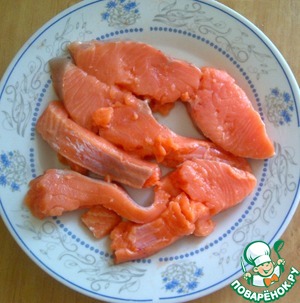 Сёмгу очистить от кожи и костей. Я делю рыбку на не очень крупные кусочки.