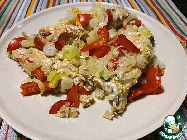 Лук-порей порезать кольцами. Перец порезать на три части, каждую из трёх частей ещё на две. Овощи должны быть порезаны шириной примерно 7 мм, не шире.