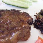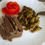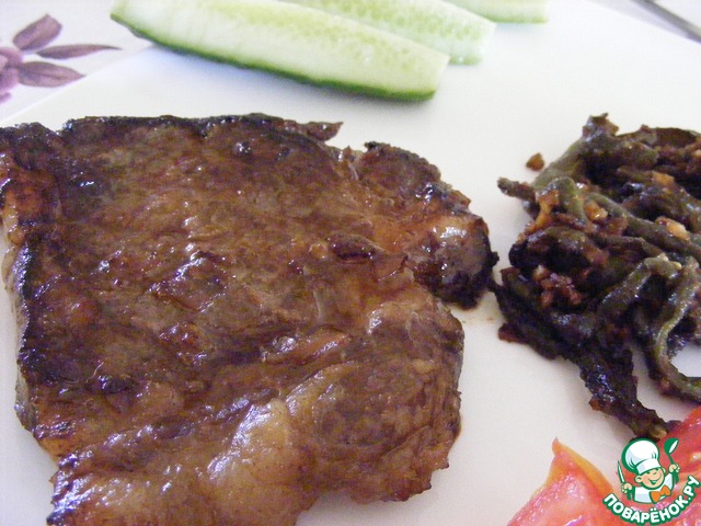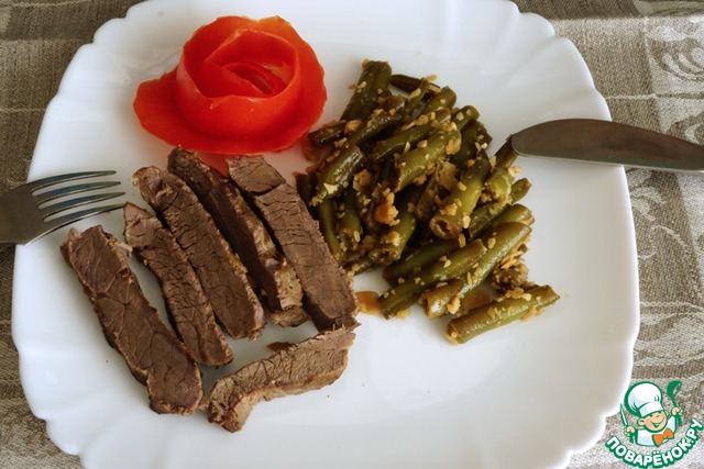За не имением такой возможности я жарила мясо на сковороде-гриль. Мясо нужно обжарить до румяности с двух сторон, обмазывая оставшимся соусом, после чего дать отдохнуть 5-10 минут, нарезать и подавать со стручковой фасолью и свежими овощами.