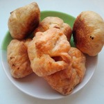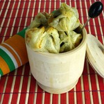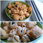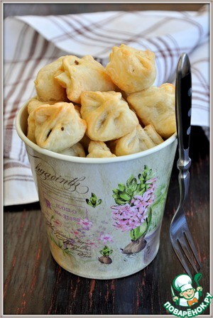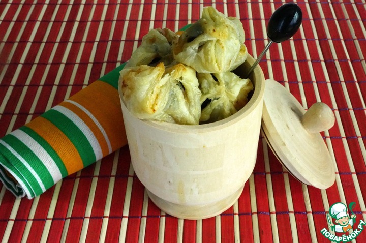Первый раз я купила тесто, но оно оказалось недостаточно раскатано, поэтому получилось много теста и мало начинки. И не совсем у нас с мужем удалось удачно слепить эти мешочки