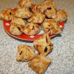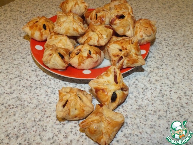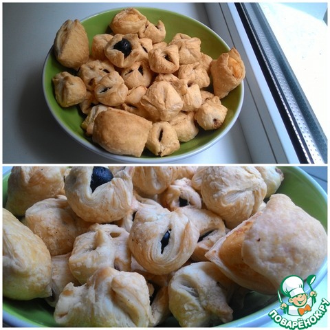 Присыпая стол мукой, тонко раскатать слоеное тесто, нарезать на маленькие квадратики. Выложить на него кусочек тонко нарезанной сыровяленой ветчины и маслину или оливку в специях. Завернуть как вам больше нравится - шариком, мешочком или просто крестообразно защипнуть.