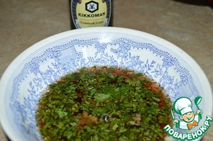 Кинзу измельчить, чеснок натереть на мелкой терке. Сложить все в миску добавить прец, соевый соус Kikkoman и гранатовый сок, перемешать.